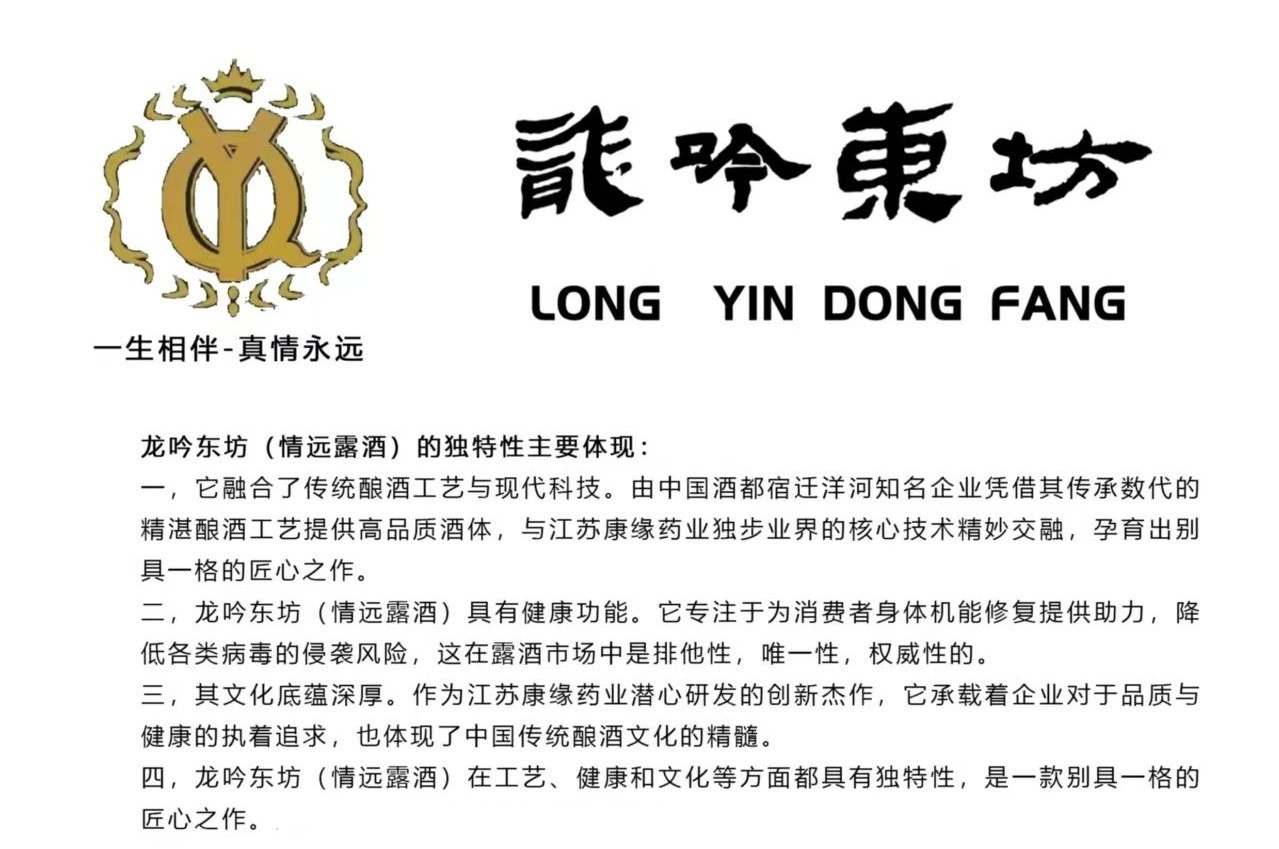 一款有助于身体健康的产品,龙吟东坊情远露酒36.9度,选用优质酒体,药材与技术开发来自于江苏康缘药业股份有限公司,由康缘全资子公司康宝鹿业生产出品,由北京叁仁品牌管理有限公司负责全国运营,该产品是建立在疫情过后有助于身体修复保养的一款全新产品!